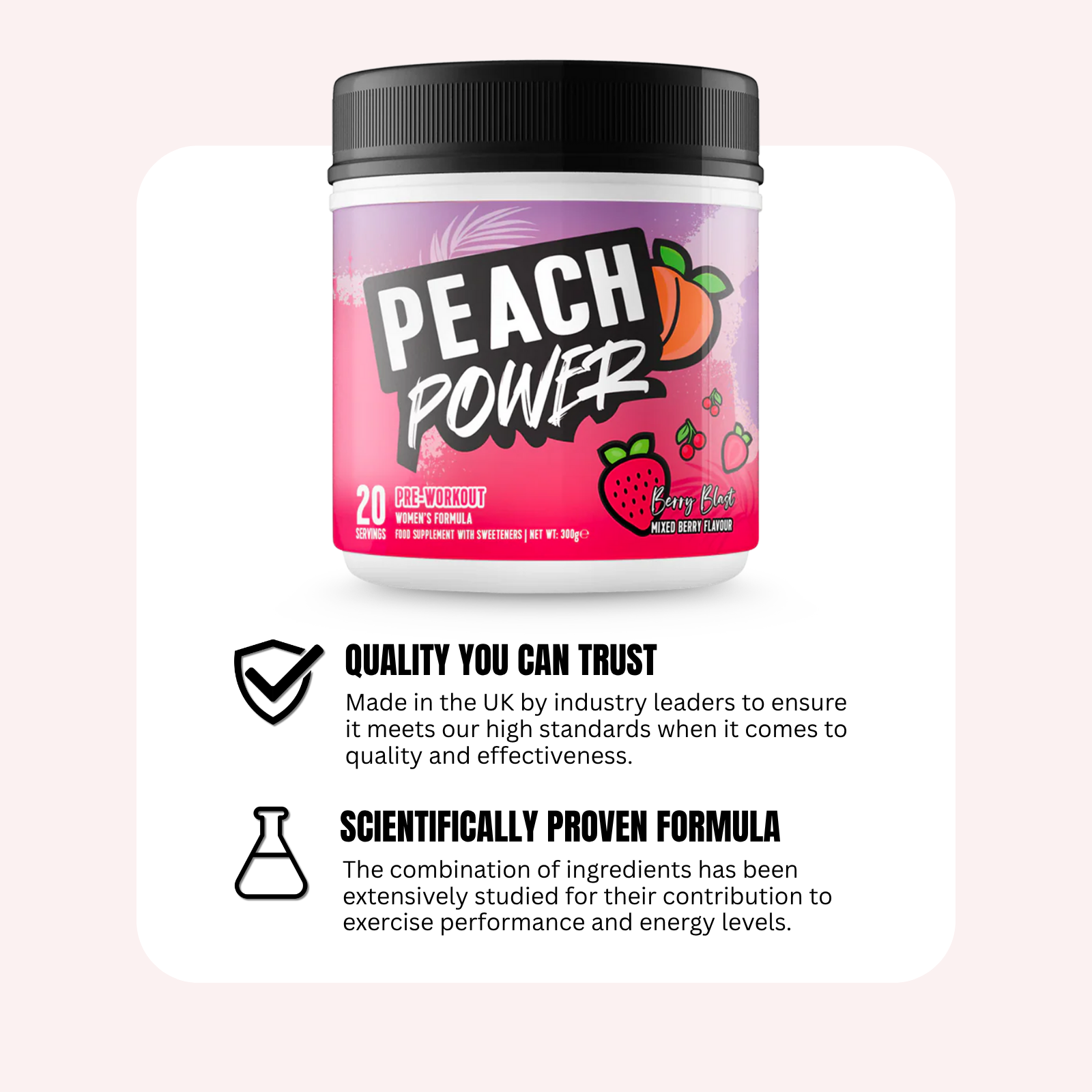 Our custom women’s formula uses reduced amounts of Beta Alanine (the ingredient that gives you the itchy or tingling feeling). With 1 scoop of Peach Power you’ll have no intense itchy or tingling feeling often associated with other pre-workouts.